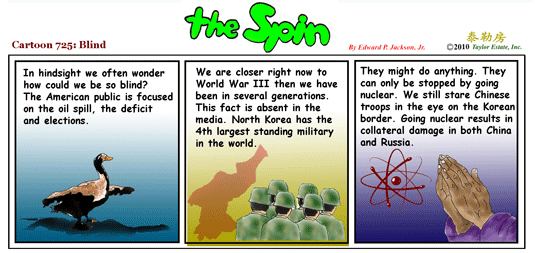 Cartoon 725: Blind When we use hindsight we now see the storm clouds that gathered to create the storm that has caught us. We were apathetic to the changing weather. As Americans our attention is on domestic politics, the oil spill, and the deficit. We ignore the ominous clouds that have formed. Any new provocative act by North Korea must be met with overwhelming force. Failure to do so and North Korea will continue to escalate its actions. But there is a very delicate line. Any response could trigger all out war and a million North Korean troops surging south. The numbers would be too great to be stopped by any conventional methods. America’s only option, if it does not abandon its South Korean ally, will be nuclear weapons. North Korea will in turn retaliate with nuclear weapons. There will be wide spread devastation. The radiation will create collateral damage in China, Russia and Japan. Most Americans do not realize that we face Chinese troops at the Korean border, even after all these decades. A confrontation will instantly involve China. If America fails to aid South Korea, the world will take note. It will further confirm America is an untrustworthy ally. The Asian countries will flock to the Chinese as an umbrella of protection. African and Middle Eastern countries will as well. They will feel more secure under Chinese power. The CIA, the Pentagon, and the State Department are burning the mid-night oil running simulations of possible North Korean actions. But it all boils down to one thing. If they respond to a North Korean action, they had better make it an instant all out activity. They will have to throw everything including the kitchen sink. It will have to be total nuclear annihilation. |